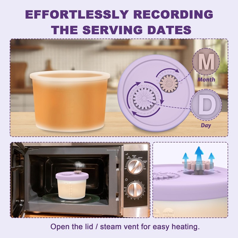 Innovative adjustable date dials (day/month) on lids help track storage time effortlessly. Airtight seals prevent leaks and lock in freshness and nutrients.