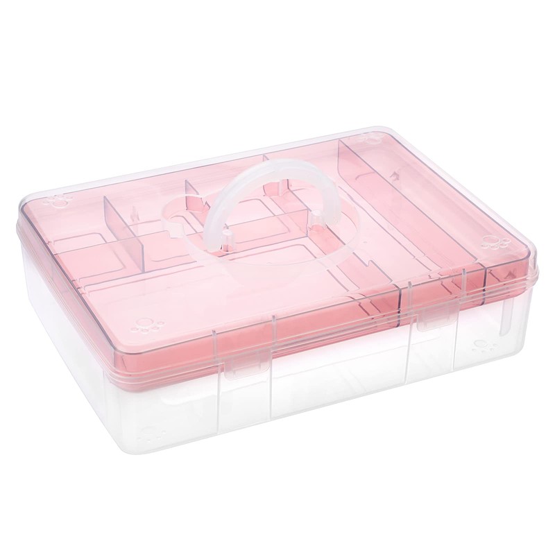 BTSKY 2-Tier Cute Bear Storage Box with Removable Divided Tray Portable Clear Plastic Art Craft Supply Organizer Stackable Home Office Supplies Storage Container for Pens Notes A4 papers etc (Pink)