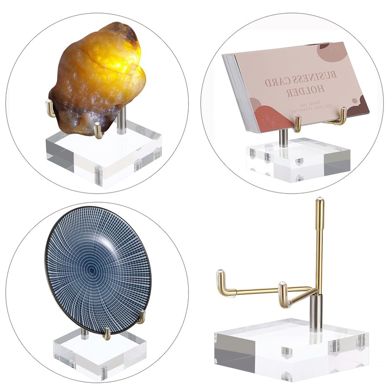 BTSKY Small Size Adjustable Golden Metal Arm Display Stand Easel with Square Acrylic Base, Display Holder for Geodes Rock Mineral Agate Fossil Coral Coin