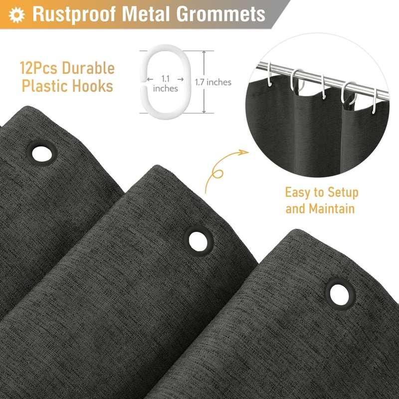 - 🛁【Standard Size】- W72”×H72”/(183cmx183cm). 12 rust-proof metal grommets (to prevent tears) that fit most standard shower hooks or rings. Package includes 1 charcoal grey Shower Curtain and 12 Plastic Hooks(Convenient to install).