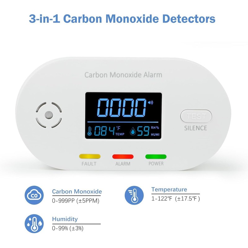 - 3 In 1 Carbon Monoxide Detectors: This carbon monoxide detector has three functions: Carbon Monoxide(0 to 999PPM), Temperature(1 to 122℉), and Humidity(0% to 99%RH) to keep your family safe.