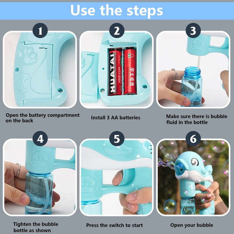 - Unique shape design: the fun and cute dolphin shape will delight children of all ages, a beautiful bubble cannon, offers your children and pets endless bubble fun, your baby can enjoy the fun of chasing bubbles.