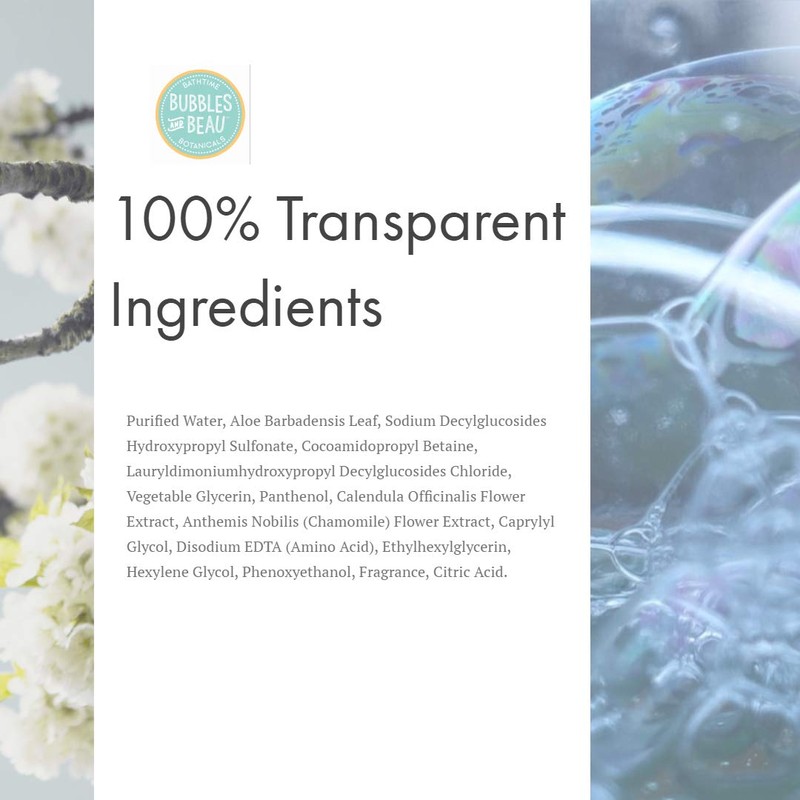 Soothing & Conditioning All Over Wash. Gently cleanses and soothes babies' & toddlers delicate skin and hair while providing essential moisture, keeping little ones soft, clean and cuddly. A soft, subtle (unisex) floral scent with a watery freshness heightened by hints of green apple, bamboo and water lily that finishes on a well-balanced rose and cedar wood accord with an understated complexity. At Bubbles and Beau we care about what your precious little ones put on their hair and bodies so we make sure our bath products are gentle and safe for everyday use. 100% American made without Animal Testing, Sulfates, BPAs or Parabens.