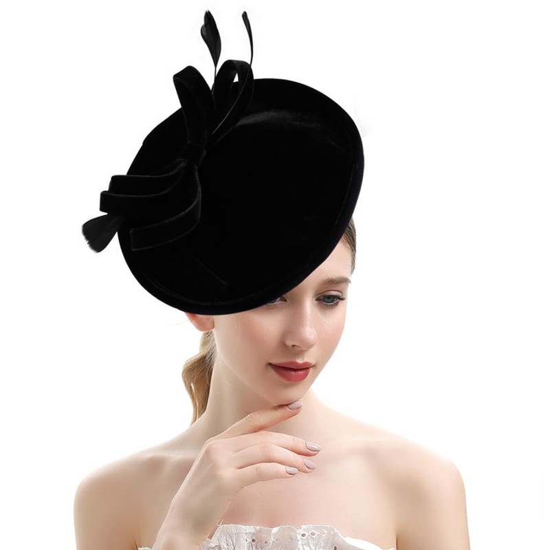 Bubbmi Women Black Velvet Fascinator Hat, Celebrity Lady Velour Feather Top Bow Church Hat for Banquet Wedding Cocktail Tea Party (9337black)