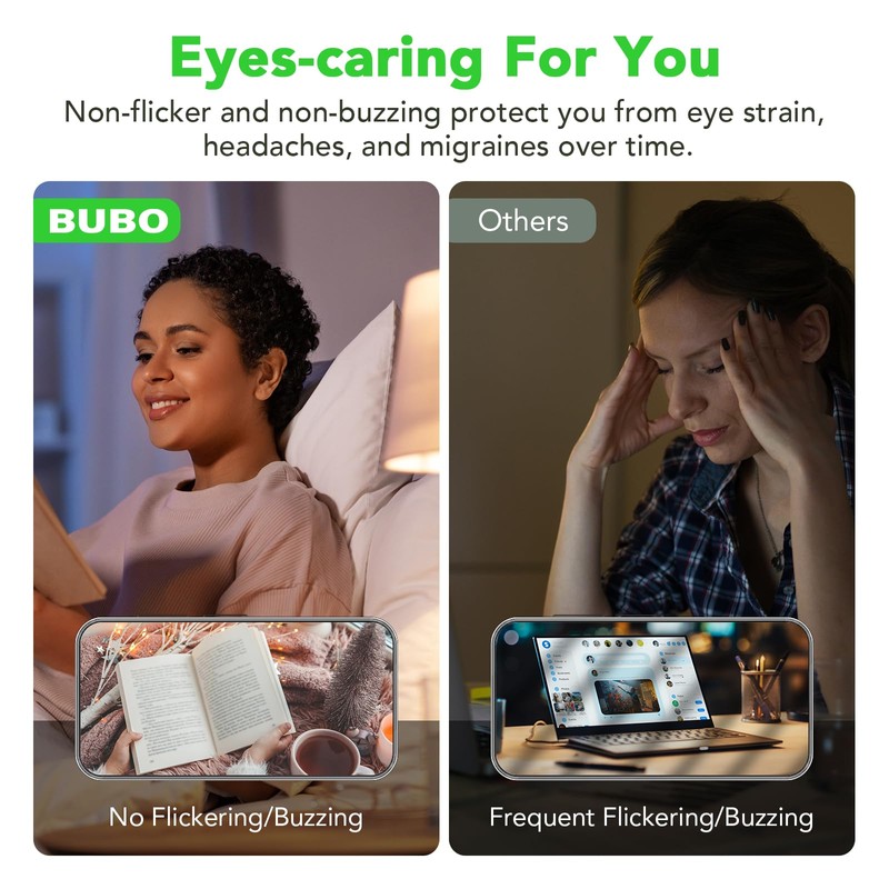 - Eye-Friendly, Non-flicker Lighting:Engineered for eye comfort, BUBO A19 60W LED light bulbs provide steady, non-flickering, and buzz-free illumination. Ideal for reading, studying, or working, they help reduce eye strain and enhance your everyday comfort.