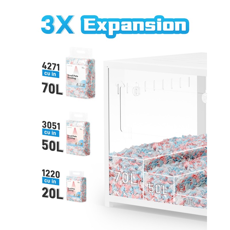 - SPEND LESS & GET MORE - 50L BUCATSTATE small animal bedding with up to 3x expansion, you can use less and still cover more space. It's like a cloud for your furry friends—soft and perfect for burrowing, tunneling, and nesting. This paw-friendly bedding is ideal for rabbits, guinea pigs, gerbils, hamsters, chinchillas, rats, or mice.