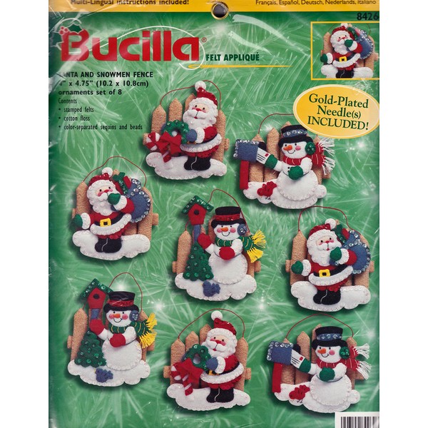 Bucilla Santa and Snowmen Fence Felt Applique Kit -- Set of 8 Christmas Tree Ornaments 4" x 4.75"