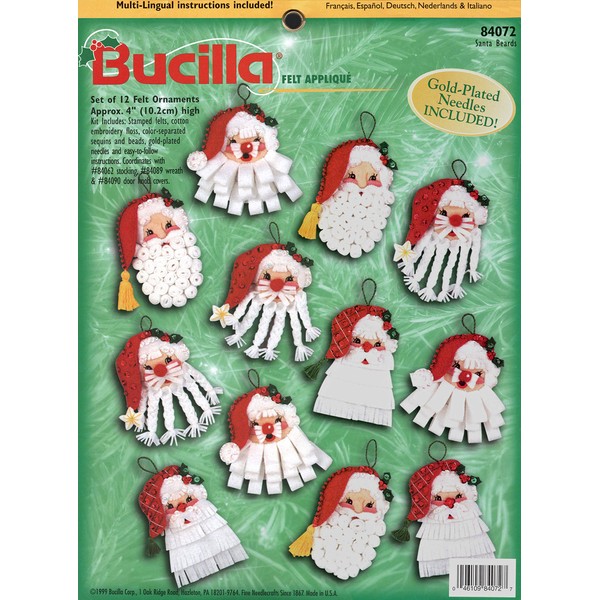 Bucilla "Santa Beards" Felt Applique Ornament Kit 84072 provides the materials for making a set of twelve tree ornaments, featuring Santas with a variety of beard styles. Use simple applique and embroidery stitches to make these ornaments measuring 4" high. Included in the kit are stamped felts, cotton embroidery floss, color-separated sequins and beads, gold-plated needles, and easy-to-follow instructions. This is a retired kit, made in the U.S.A. by Bucilla Corp.