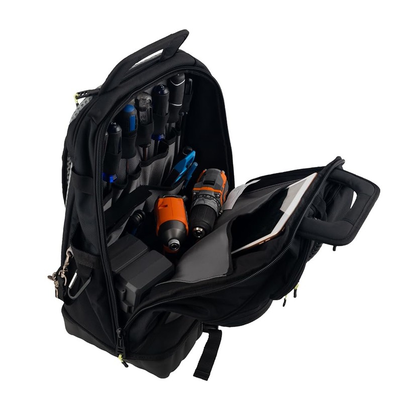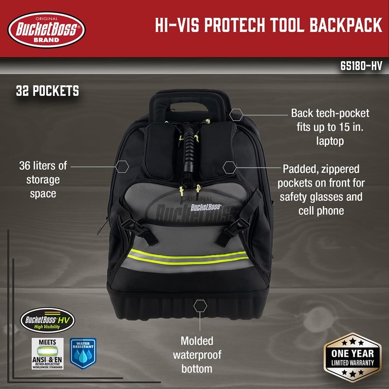 Bucket Boss High-Visibility Pro Tech Tool Pack with StayPut Handle Grips, Waterproof Molded Rubber Bottom, Waterproof Zipper, 32 Total Pockets, in Grey, 65180-HV