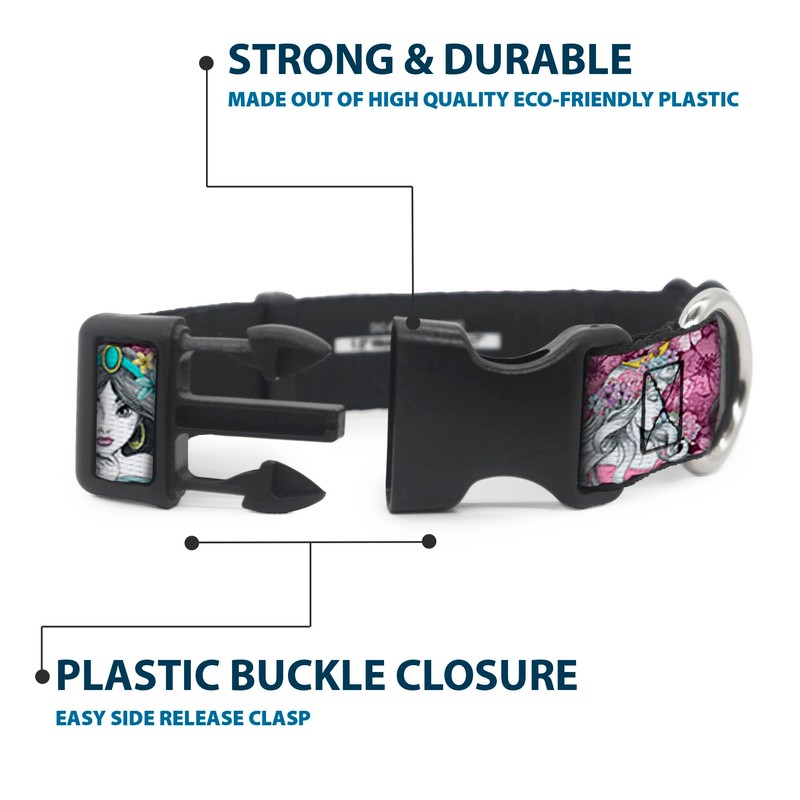 • Dog Collar Plastic Clip Buckle, Princess Sketch Poses/Floral Collage Pinks/Grays, 1-Inchx11-17-Inch