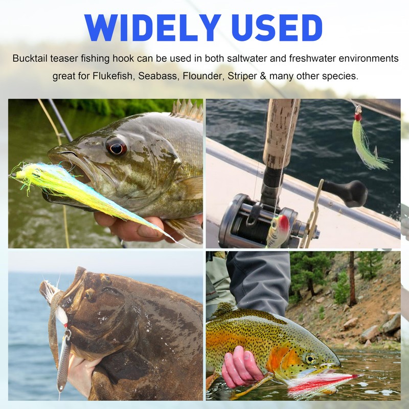- BUCKTAIL TEASER: Bucktail teaser fishing hooks features hand tied bucktail/crystal tail with bright colors, which adds a fish-attracting flash and movement to saltwater rigs,increasing your chances of a successful catch.