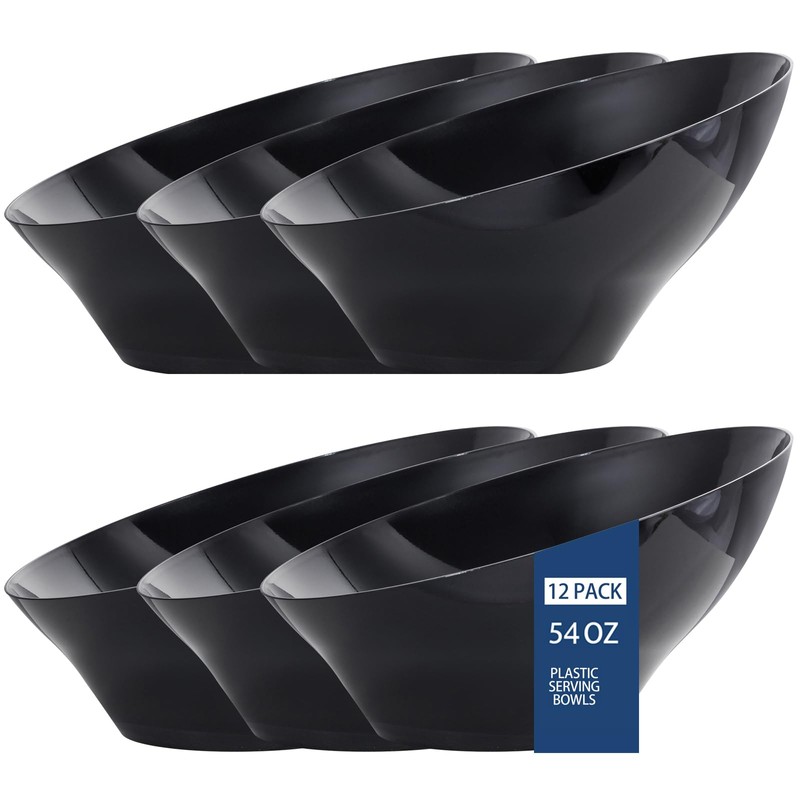 bUCLA 12 Pack Black Plastic Serving Bowls - 54 OZ Angled Bowls Disposable for Chip&Candy - Party Table Salad and Fruit for Party & Wedding