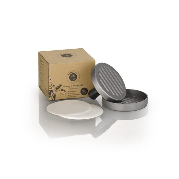 Buddy's BBQ Burger Press, Hamburger Press, Burger Patties, Hamburger, Vegetable Burger, Non-Stick Aluminium, Polypropylene Handle, Includes 100 Sheets of Paper, Diameter 12 cm Outside