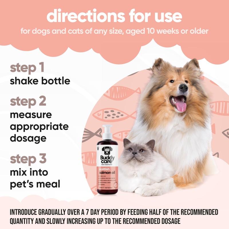• EASY TO USE & 100% NATURAL: Buddycare salmon oil is a simple, 100% natural supplement with only added Vitamin E (antioxidant). Simply add the recommended dosage to your pet's food and enjoy the benefits of a no-fuss health boost. It's suitable for pets aged 10 weeks and older, and the easy-to-dispense bottle makes it ideal for adding to food or as an occasional treat. A simple and convenient way to give your pet the nutrition they need.