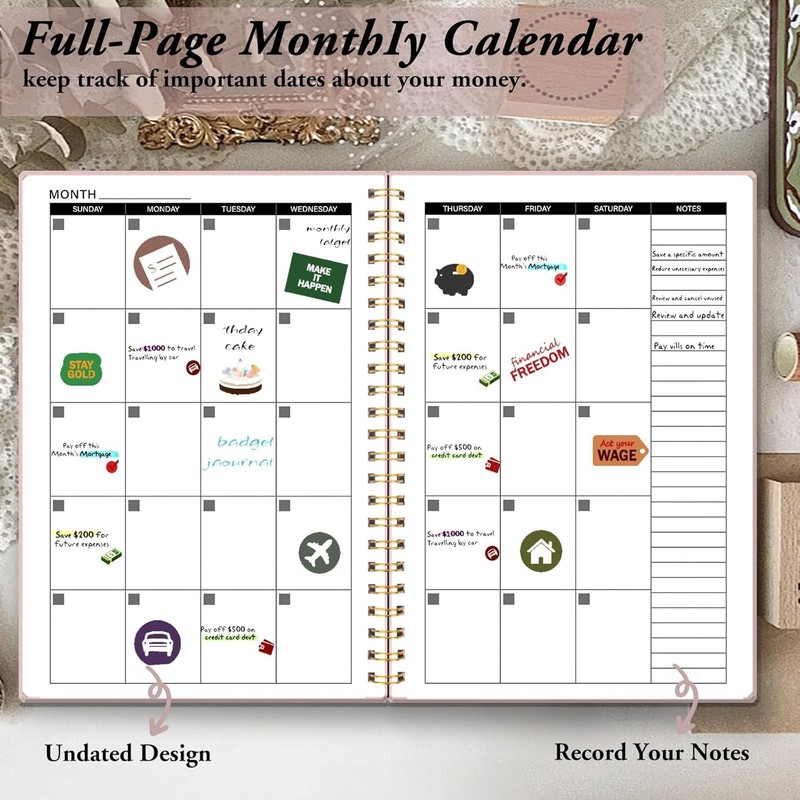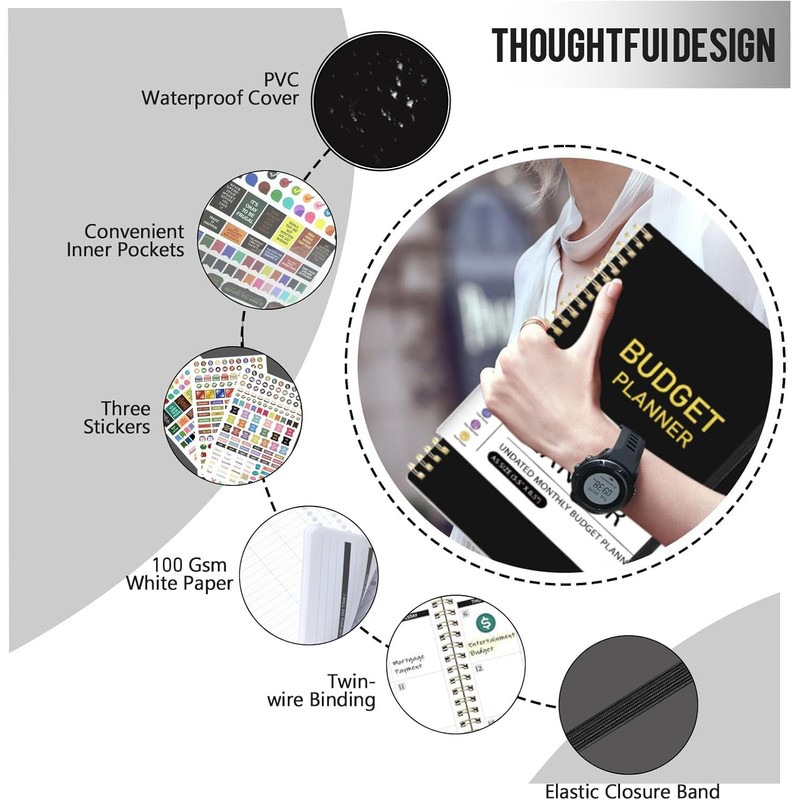 - Thoughtful Design: This monthly planner has many thoughtful designs. The spiral design is convenient for turning pages or tearing them off. The elastic band is convenient for fixing items and quickly locating the current page. The colorful stickers is suitable for you to mark important things.The back pocket can be used to store your bills, invoice, cash, etc., making it convenient for your daily financial planning
