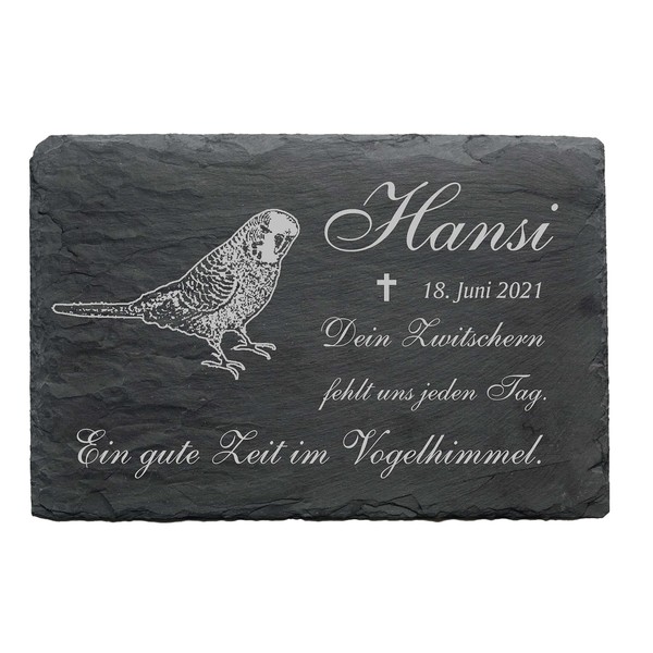 • Decorative grave plaque memorial plate made of slate with pictured budgie engraving. Your desired name and date.