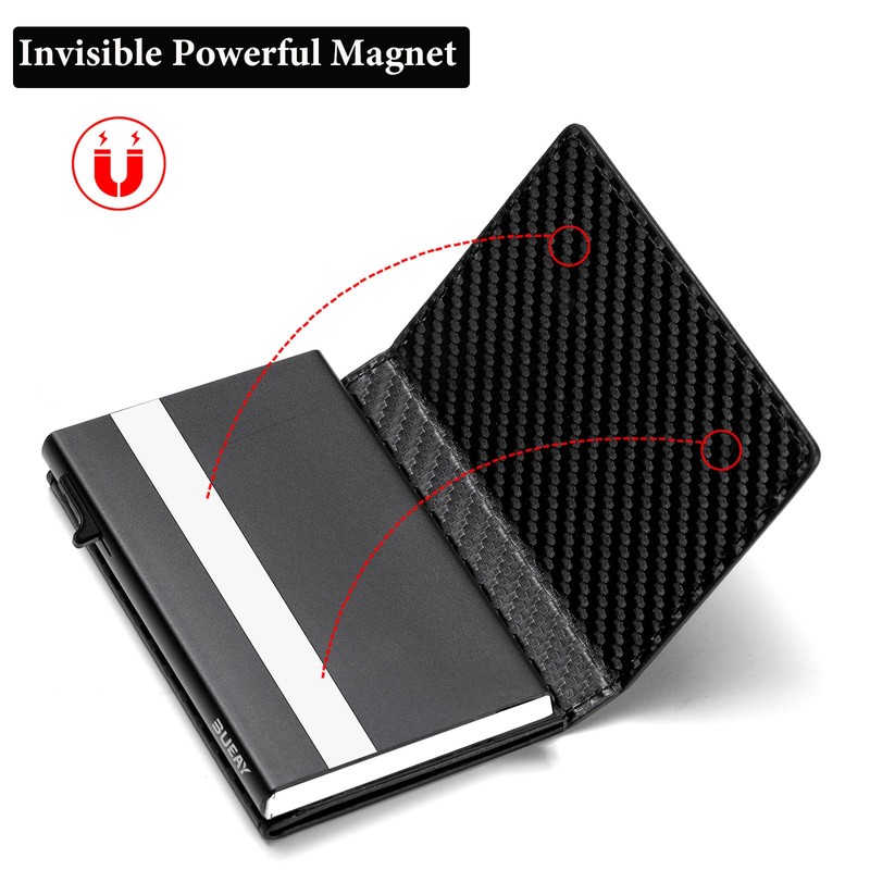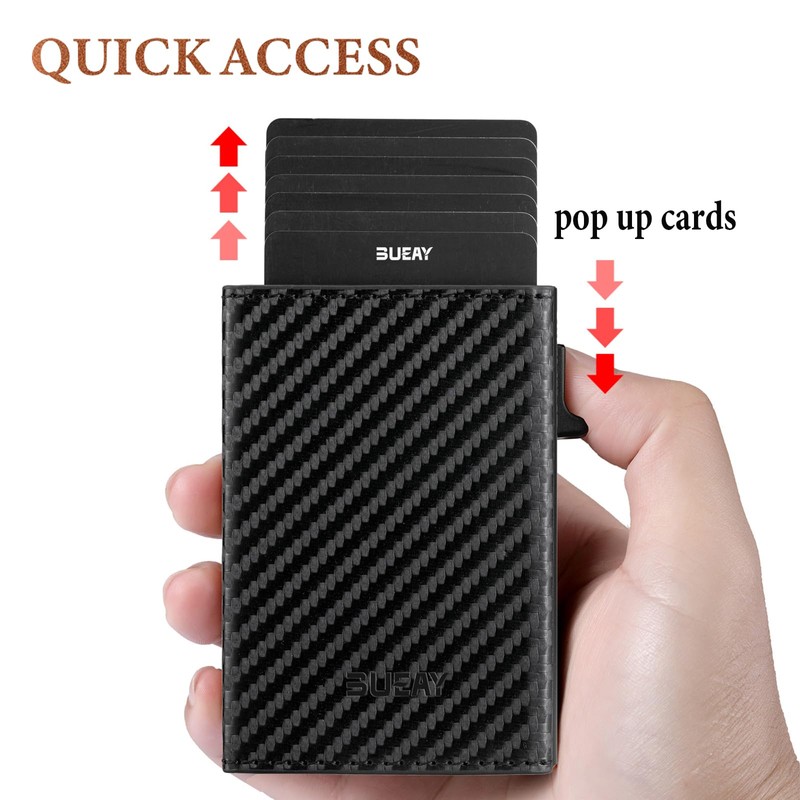 - ✔ QUICK ACCESS - Auto card pop up button and invisible magnetic closure makes it easy to insert and remove your cards at any time. Built-in metal card slot allows you to insert and remove multiple cards at once for quick access. One second Built-in metal card slot allows you to insert or pop up multiple cards at once and quickly take out in one second. One hand switch will lock your cards and keep them from falling apart. With proper access to cards, life will be easier and simple
