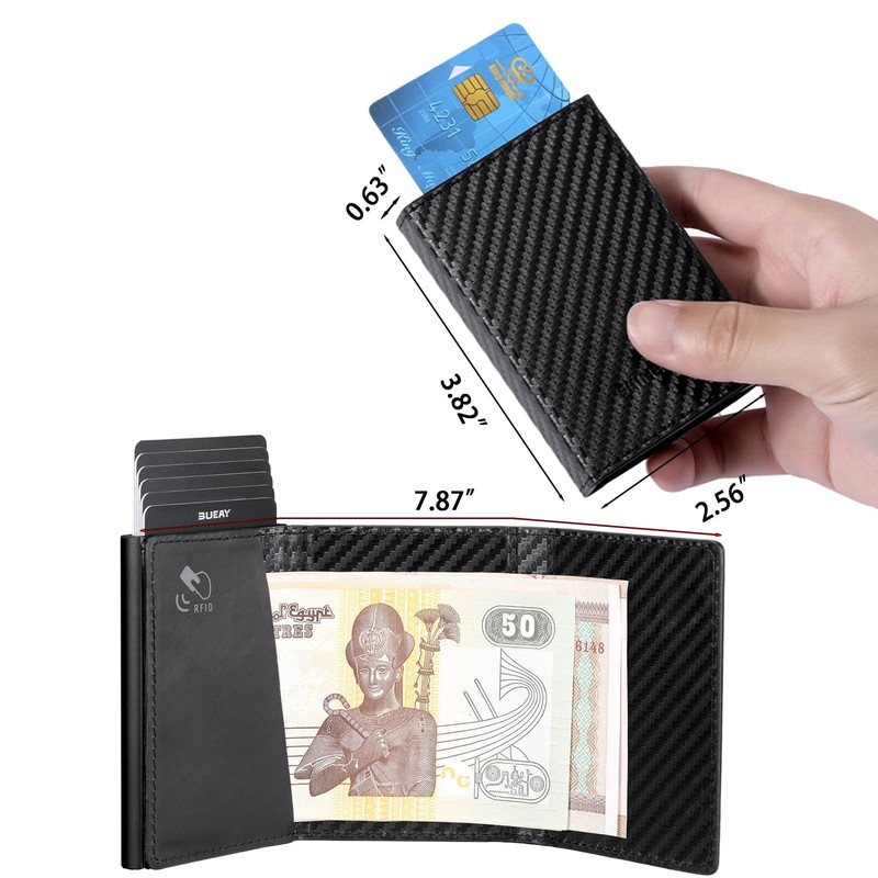 - ✔ SLIM MINIMALIST DESIGN - Pocket size is 3.82"L * 2.56"W * 0.63"H, lightweight (3.32 oz). Aluminum card case compartment with opening arm for 6 cards, plus additional compartments for cards or cash. You can store your cards without folding them, and you can easily carry them in your front or back pocket