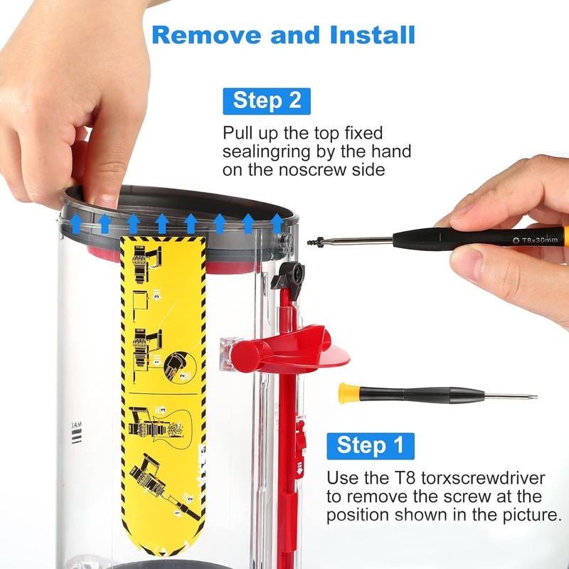 - ✔︎【Fácil de instalar】Sólo tiene que alinear los orificios de los tornillos del anillo de sellado con los orificios de los tornillos del tambor de la caja de polvo, encajar el anillo de sellado en su sitio y, a continuación, apretar los tornillos con un destornillador para una instalación correcta. Sustituir un nuevo anillo de sellado del cubo de la basura sólo lleva 3 minutos y también suministramos un destornillador universal T8.
