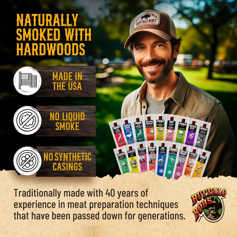 - HIGH QUALITY: Each of our sticks are naturally smoked with Hardwoods. We do not add liquid smoke to our products like many competitors, and none of our stick casings are synthetic.