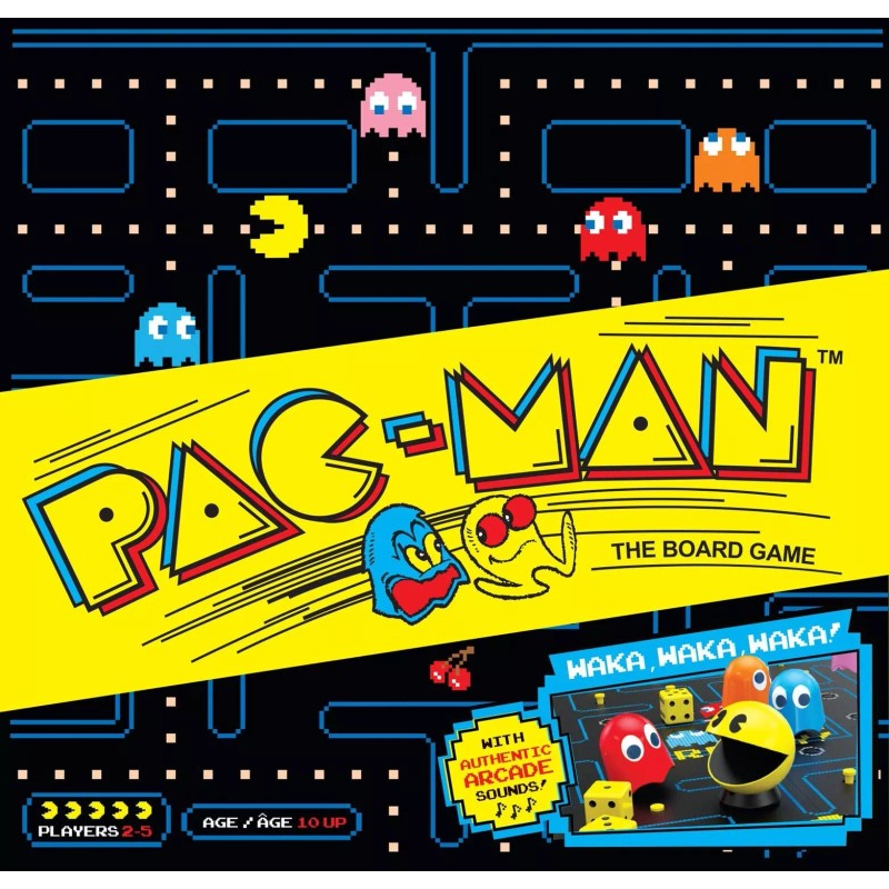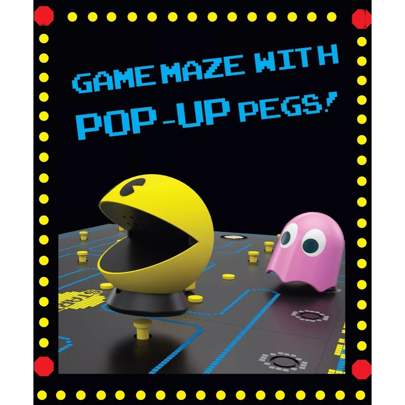 PAC-MAN - The Board Game Rediscover the arcade classic all over again! Master the maze, beat the ghosts, get your initials by the high score! Stay alert, move quick, and be smart. Gulp down power pellets and eat the ghosts for extra points in this collaborative and competitive game. Game contains 1 maze game board (4 parts), 1 electronic PAC-MAN pawn, 4 ghost pawns, 35 level 1 ghost cards, 5 level 2 ghost cards, 3 yellow PAC-MAN dice, 4 ghost eyes tokens, 4 power pellet tokens, 16 blue ghost tokens, 3 fruit tokens, 3 PAC-MAN life tokens, 4 scoring pieces, 1 high score note pad.