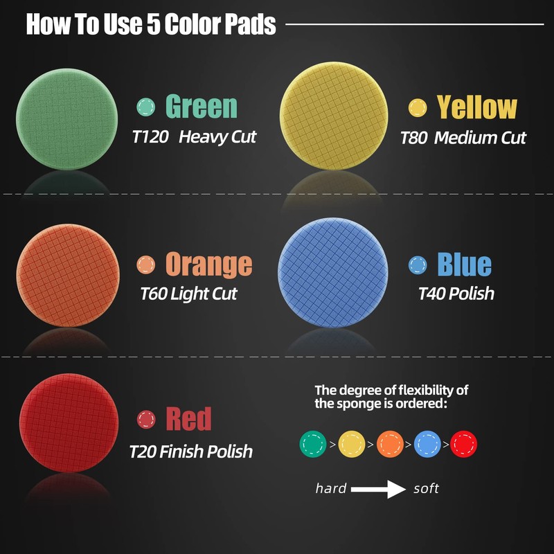 - ◆Compounding & Polishing & Waxing◆ There are five different colors of the sponge pad : Green/Yellow For Heavy Cut ,Orange For Medium Cut ,Blue For Light Cut ,Red For Finish Polish and Waxing, Great for removing sun abuse, car scratches, headlight wearing and etc. Green/Yellow Heavy Cut pad suitable for removing oxidation coating and moderate to light scratches. Orange polishing pad for removing sun abuse and swirl mask. Blue pad for polish, The red for finish polishing and waxing.