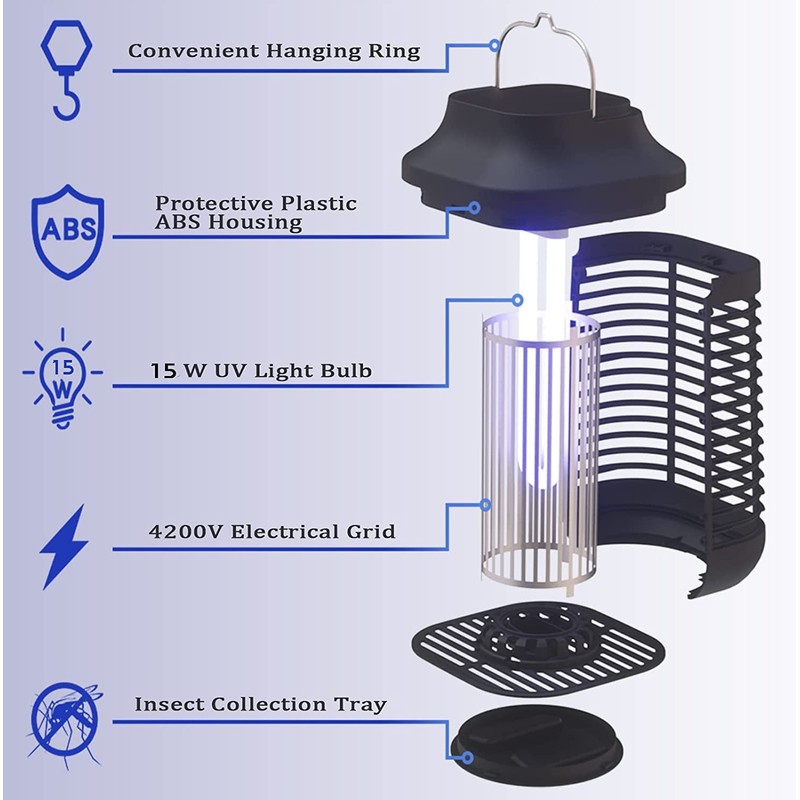 - Effective Physical Mosquito trap: insects and bugs or moths have phototaxis and bug zappers are designed fot this,the light of the bug zapper will attract bugs and mosquitoes and the 4200V ELECTRICAL GRID will kill mosquitoes.The internal grid is designed with a narrow protective housing to prevent people and pet from accidental contact.