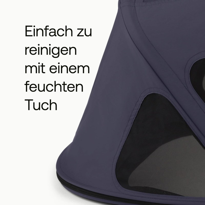 Das integrierte Moskitonetz bietet Schutz von Kopf bis Fuß und passt sowohl auf die Liegewanne als auch auf den Sitz. Die Stoffe sind wasserabweisend und lassen sich leicht mit einem feuchten Tuch reinigen