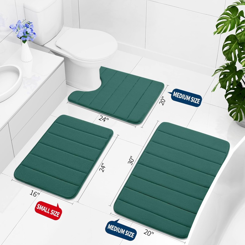Buganda Memory Foam 3 Pieces Bathroom Rugs Set - Thick Soft Absorbent Non-Slip Bath Mats, Washable Small/Large/Contour Bath Rugs, Dark Green