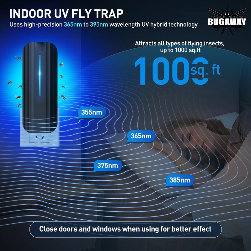 【New Fly Trap Technology】BUGAWAY fly trap indoor uses dual-wavelength 365-395nm nano-UV light, precisely covering the sensitive light wave range of mosquitoes. The dual-wavelength enhances the capture efficiency, triggering the phototactic instinct instinct of insects. Fruit fly trap can simultaneously attract flies, fruit flies, moths, and gnat and other flying insects. Combined with a powerful adhesive plate, it achieves rapid capture