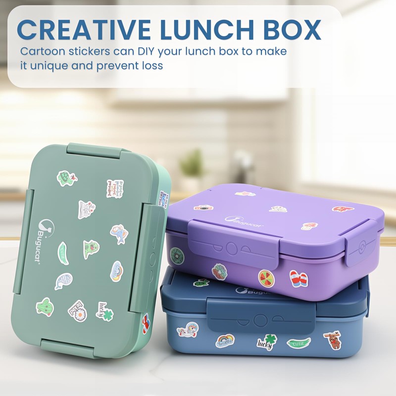 - 【HIGH-QUALITY MATERIALS】Bugucat lunch box is made of high-quality PP material, which is non-toxic, odorless and BPA-free. Each accessory of the kids lunch box has an increased thickness of 1-3mm, which is sturdy and durable, not easy to deform and damage, and can be reused for many years, suitable for children over 3 years old and adults