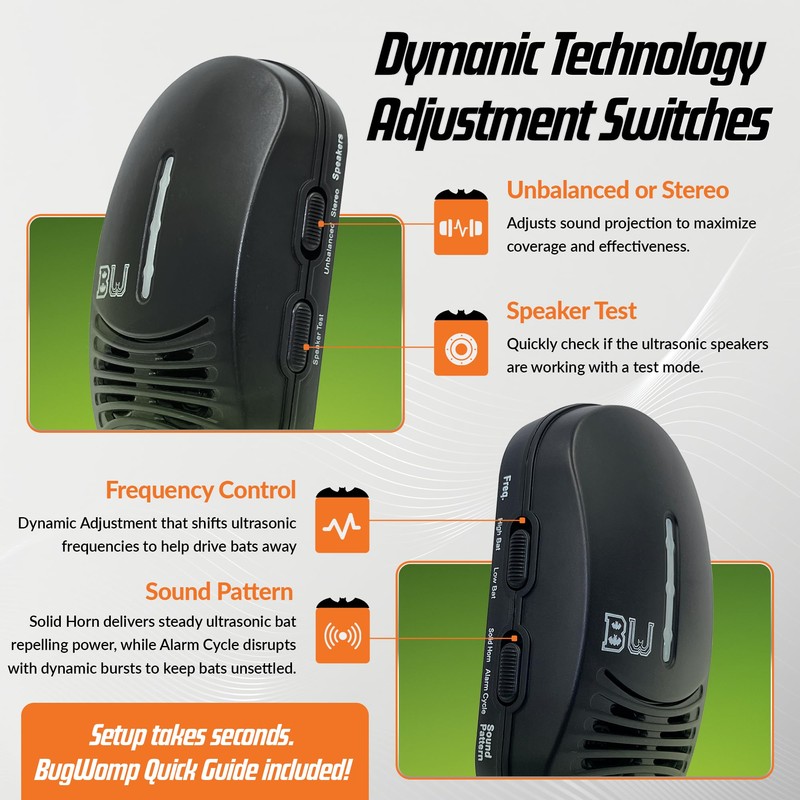 - BugWomp BEU Midnight Black Edition Showcasing Dynamic Bat Repelling Technology: This advanced bat repeller features multiple adjustment settings, ensuring bats cannot adapt to the ultrasonic bat repelling sounds