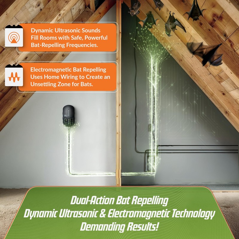 - Electromagnetic Dual Repelling Power: In addition to safe ultrasonic bat repelling, this device uses Electromagnetic Repelling through your home's wiring to repel bats within walls—no adjustments needed, as it follows dynamic bat control switches
