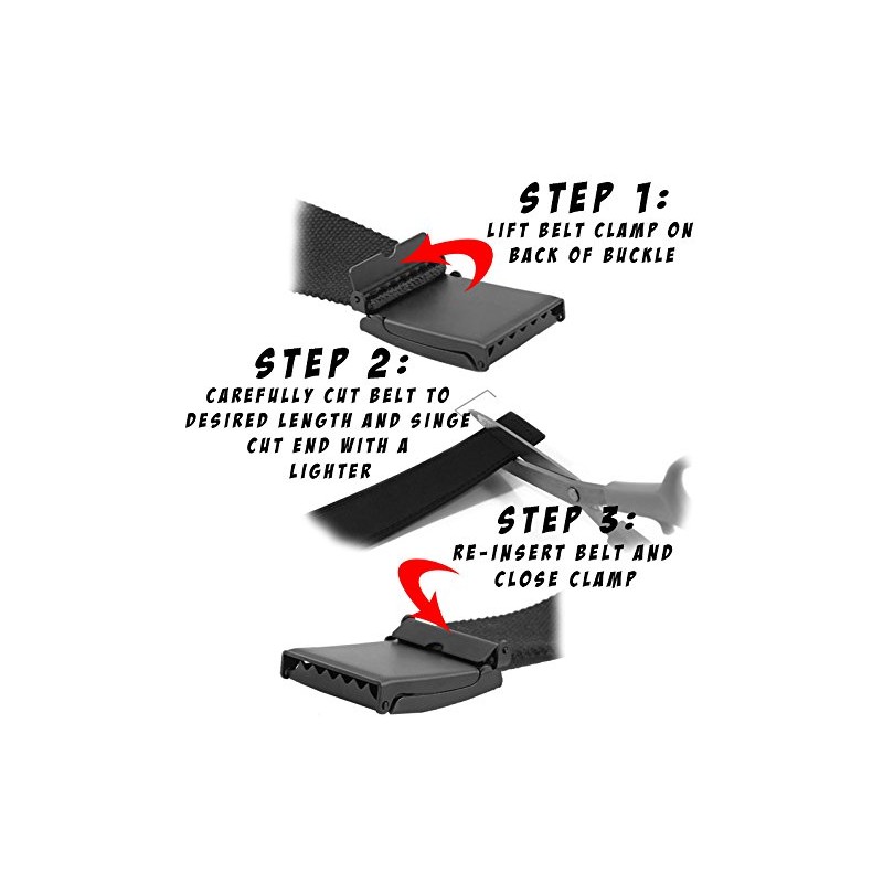 The canvas web belt is resizeable, and can be removed from the buckle. The belt can be easily cut, and then the end burned. Belt comes with matching black enamel tip on one end.