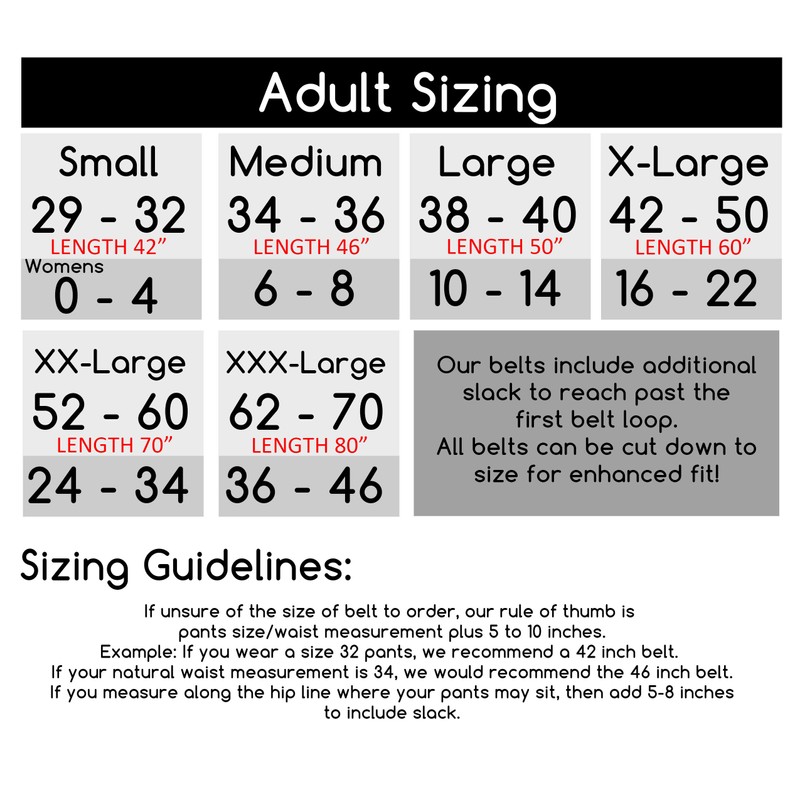 - Size chart can be found in the listing images. Total belt length is in "Red Font"