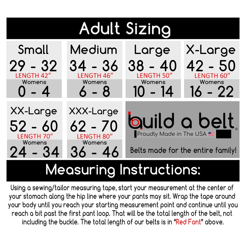 - Size chart can be found in the listing images. The total belt length is in "Red Font"