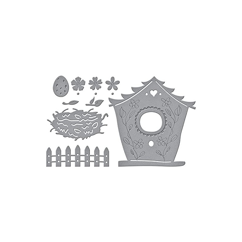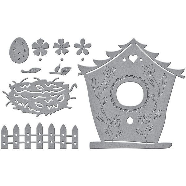 - Birdhouse: 3” x 3.1” (7.6cm x 7.8cm), Opening: .85” x .76” (2.1cm x 1.9), Egg: .56” x .75” (1.4cm x 1.9), Fence: 2.2“ x .76” (5.6cm x 1.9cm), Nest: 2.1“ x 1.1” (5.3cm x 2.8cm), Round Flower: .5 x .48” (1.2cm x 1.2cm), Dip Flower: .48“ x .47” (1.2cm x 1.2cm), Leaf: .38“ x .66” (96cm x 1.6cm), Pointed Flower: .52“ x .50” (1.2cm x 1.2cm)