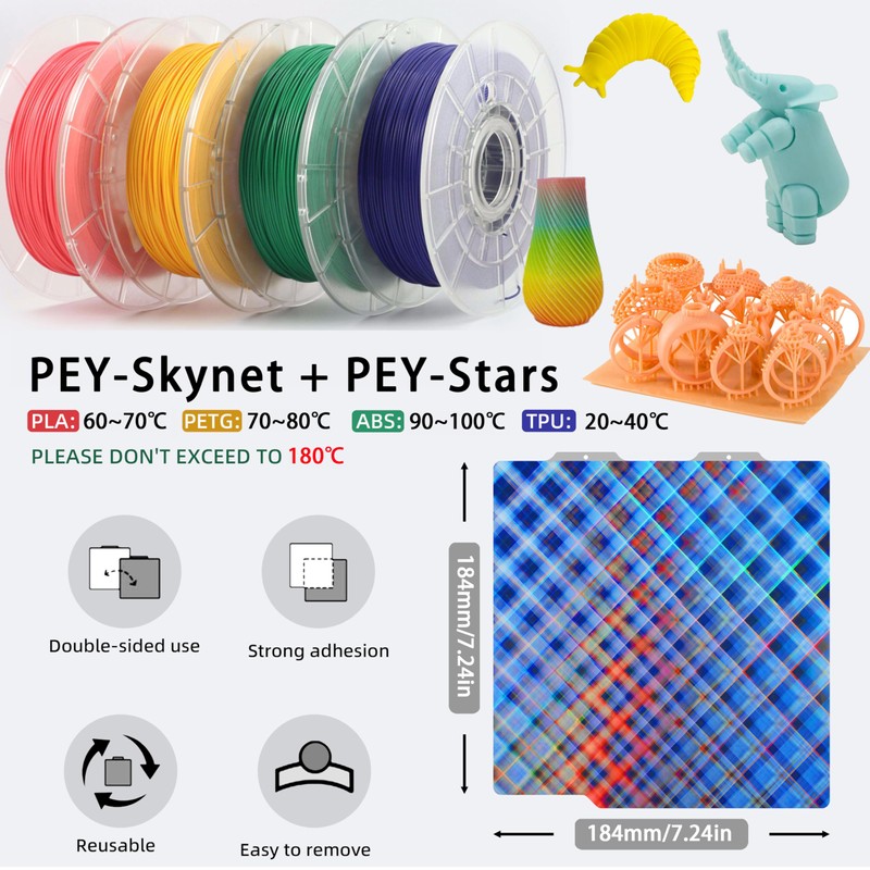 • PEY Build Plate: The PEF+PEY print bed surface is resistant to high temperature 180℃. After our extensive testing, We recommend these filaments & temperatures for your PEF PEY build plate "PLA: 60~65℃; PETG: 70-80℃, If you want to print other filaments, please adjust the parameter