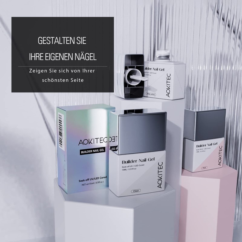 - 7-in-1 builder gel for gel nails: Aokitec as the leading brand of nail products, after countless tests and improvements, the improved multifunctional builder gel brings you great surprises, 7 fantastic functions, can be used to improve nails, extend nails, build gemstones, jewellery, foundations, nail tip gels, and help you create the look of your dreams.
