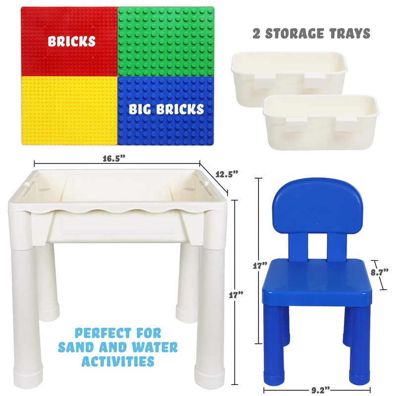 - This Activity table set includes a chair and 2 storage container shelves that attach. (NO BUILDING BRICKS INCLUDED)