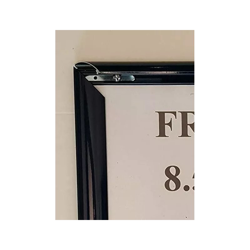 ONE SNAP FRAME 8.5x11 -Durable frame · Dimensions of notice 8.5X11 INCH · Heavy Duty Aluminum Frame · No need to remove the frame from the wall when changing Notice · Notice are kept clean behind a UV resistant, anti-glare PVC front sheet The frame does not come with picture or image. FRONT LOADING: The use of this aluminum frame is fairly easy. To load or change a graphic, simply snap open the four spring-loaded frame edges, remove the anti-glare transparent cover and place graphic, picture, photo, poster and or artwork as required, then snap close the frame edges. The corners of this frame is mitred with safe round edges. The anti-glare cover allows a clear view of the print, poster and protects the artwork from dust and direct light.DURABLE: It is made of the finest materials while providing the highest level of quality. The aluminum profile makes the product durable yet light to carry easily. Anodized finish will protect the frame from dust and light scratches. VERSATILE: Suitable for indoor use. It can be used portrait or landscape (vertical or horizontal). An excellent way to get attention when you want to display pictures, photos, posters, documents or certificates, marketing advertisements, promotions, important messages. It can be used in a multipurpose setting, whether this may be at your place of business, office, markets, cafes, restaurants, shopping centers, cinemas, cafes, theaters, hospitals or more."