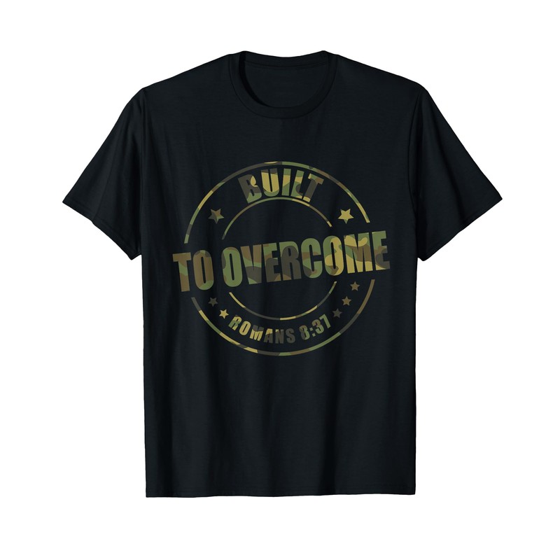 - Christian camo workout tee featuring Built to Overcome scripture design. Wear at the gym, during training, or at church to express faith proudly.