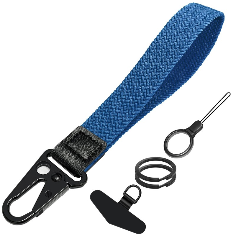 - 1. Stretchy wrist lanyard strap includes 1 wristlet strap, 1 stainless steel tether tab, 1 String, and 2 key rings. When you are going shopping, walking your dog, walking or hiking, the wristlet lanyard is perfect for being hands free running errands.