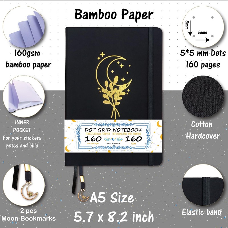 - ★ Dotted Notebook: Featuring a grid of faint dots spread evenly across each page. This 5x5 mm spacing offers flexibility, as it can be used for various purposes such as sketching, bullet journaling, note-taking, and creating graphs or charts. The dots provide a subtle guide without the rigidity of lines or the distraction of grids, making it ideal for both structured and freeform layouts.