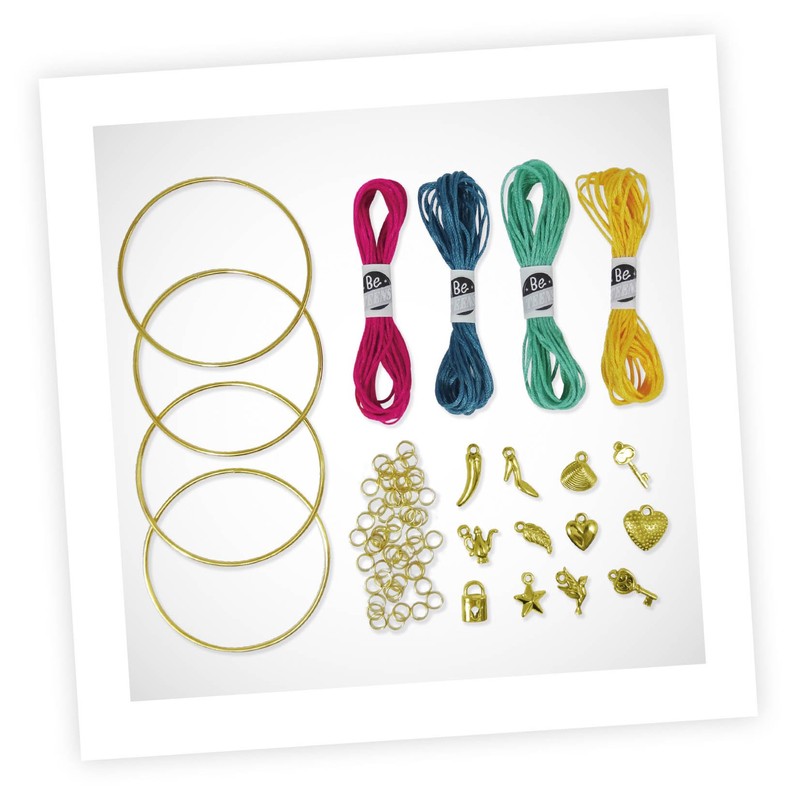 - This set includes: 4 metal bracelets, 4 colours cotton thread, 60 rings, 12 charms.