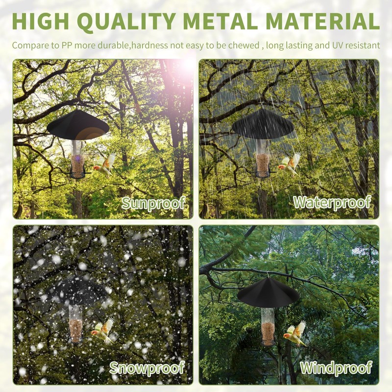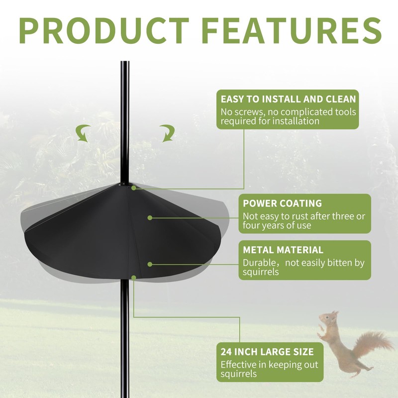 • Metal Material :The squirrel baffle is made of thickened metal, which is more durable and resistant to squirrels' gnawing compared to ordinary plastic baffles. The metal surface has been specially treated, sturdy and stable in all kinds of adverse weather conditions (such as rain, wind, snow), so that it can be used for a long time without damage. This durable design guarantees long-term use and reliability, making it a superior choice for protecting your bird feeder from squirrels