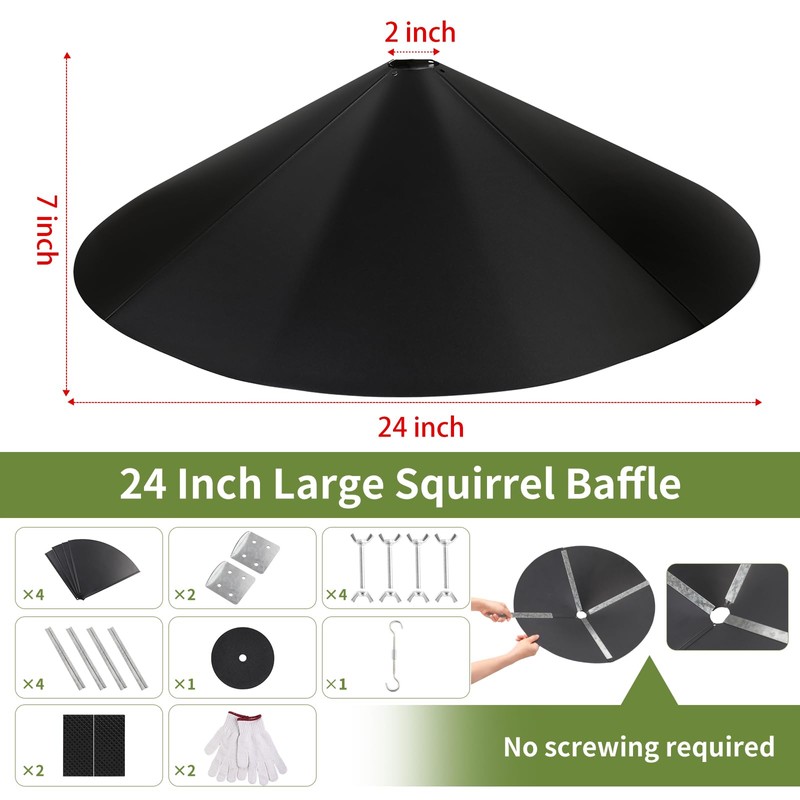 • Extra Wide and Effective:BULFULL squirrel baffle adopts 19/24 inches extra wide design, which significantly improves the effectiveness of squirrel prevention.Its unique metal retainer design makes the baffle more flexible and prevents squirrels from getting to the bird food, whether they are flying or climbing from above.This innovative design not only protects the bird's food,but also ensures that your bird cage is free from squirrels, making it ideal for squirrel-proofing outdoor bird cages