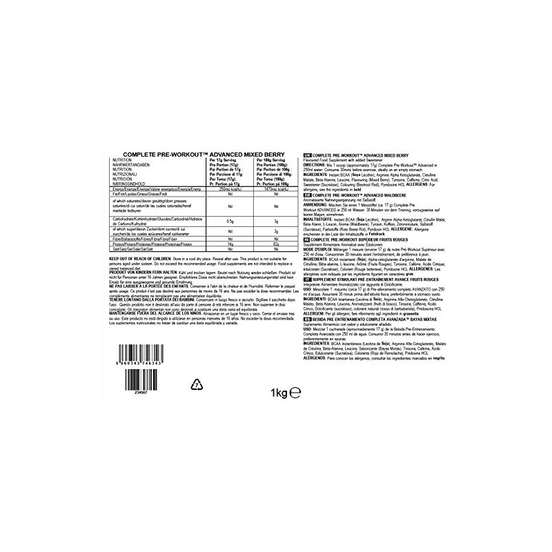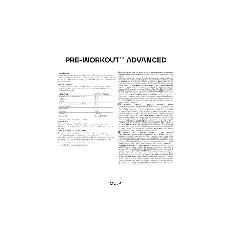ProduktbeschreibungBulk Complete Pre-Workout Advanced ist ein stark aufgeladenes Pre-Workout-Getr?nk, das Ihnen hilft, das Gute aus Ihren Trainingseinheiten herauszuholen. Wenn Sie Ihre Leistung verbessern m?chten oder einen Energieschub brauchen, wenn Sie sich lethargisch f1hlen, ist Complete Pre-Workout das ideale Produkt f1r Sie.Mit 5 g verzweigtkettigen Aminos?uren, 3 g Arginin-Alpha-Ketoglutarat, 2,5 g Citrullin-Malat und 1,7 g Beta-Alanin pro Portion sowie bew?hrten Dosierungen von Tyrosin (400 mg) und Koffein (200 mg) kombiniert unser Complete Pre-Workout eine beeindruckende Reihe von N?hrstoffen, die synergetisch wirken und Ihnen helfen, Ihre Ziele zu erreichen.Inhaltsstoffe / ZutatenBCAA (Leucin, Isoleucin, Valin), Arginin Alpha-Ketoglutarat, Citrullin-Malat, Beta-Alanin, Aromen, Leucin, Tyrosin, S?uerungsmittel (Zitronens?ure), Koffein, S1?stoff (Sucralose), Instantisierungsmittel (SOJA-Lecithin),Farbstoffe (Rote Beete-Rot), Vitamin B6.ALLERGENE: Allergene erscheinen auf der Liste der Inhaltsstoffe in GROSSBUCHSTABEN beachten.Kann Milch, Eier, Soja, glutenhaltiges Getreide, Fisch, Krebstiere, Weichtiere, Senf, Sesamsamen, Schwefeldioxid und Sulphite enthaltenWarnhinweiseDieses Produkt enth?lt Beta-Alanin, das ein Kribbeln, Jucken oder Err?ten der Haut verursachen kann. Diese Auswirkungen sind harmlos und vergehen normalerweise innerhalb einer Stunde nach Gebrauch.Anschrift Hersteller/ImporteurBulk, 1 Gunfleet, Colchester, CO4 9QX, UK / Bulk, Centrum Logistyczne, ??kowa, 23, 55-095, Mirk?w, Poland