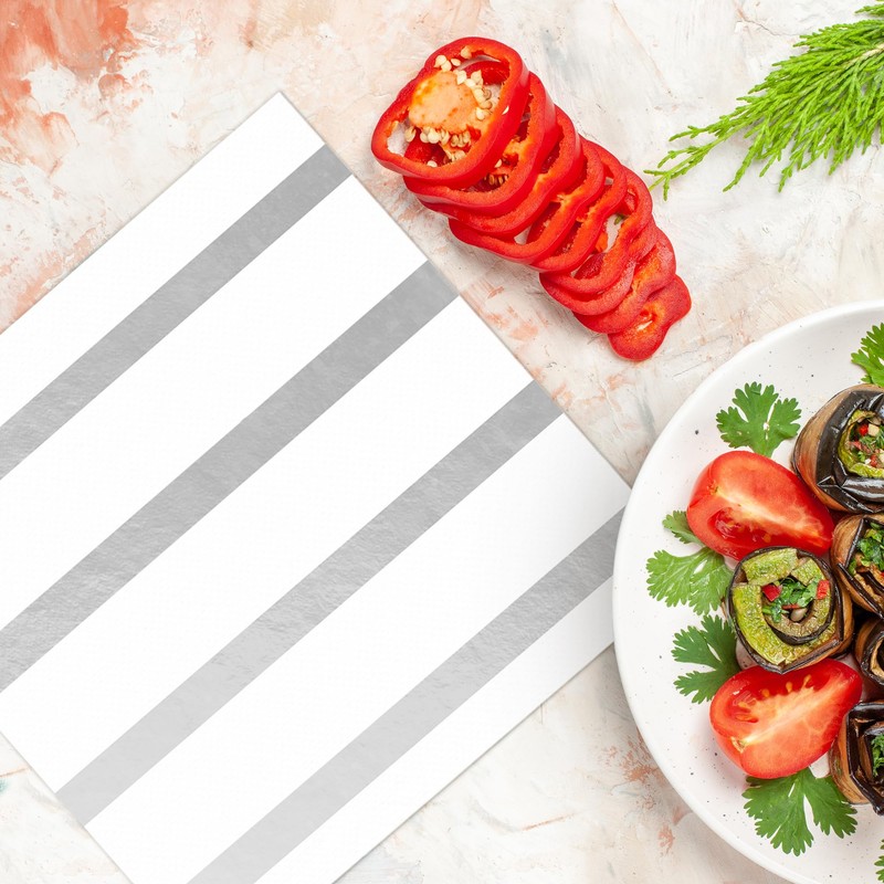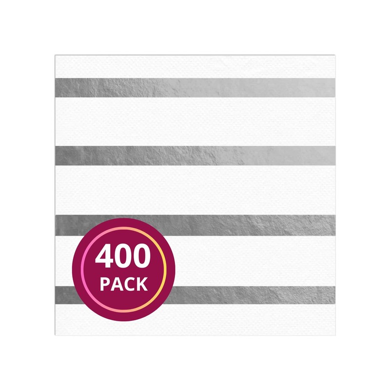 Bulk Napkins For Events - Soft Paper Napkins For Kitchen Set, Baby Shower, Bridal Shower - Cocktail Napkins Disposable (White and Silver Stripe, Beverage Napkins (400 Napkins))