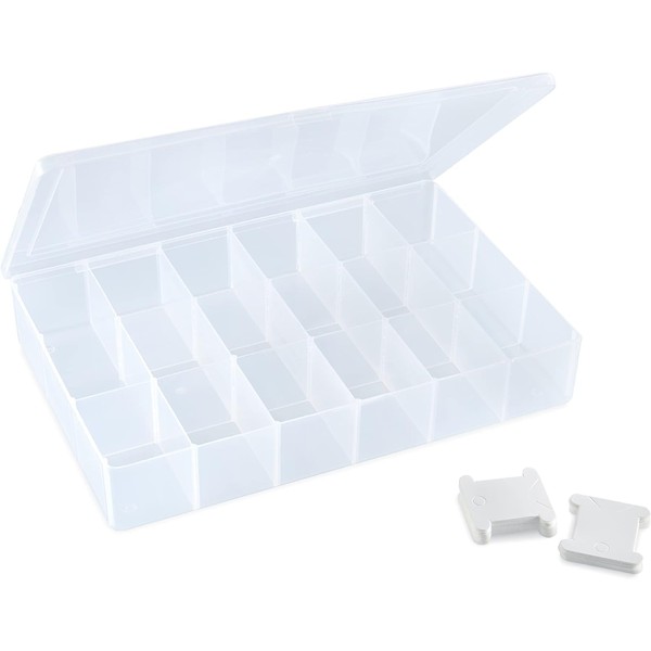 BULK PARADISE Embroidery Floss Organizer Box with 50 Cardboard Bobbins - 17 Compartments Clear S Organizer Storage Case, 10.25” x 7” x 1.75” – Snap-Tight Bead Holder, (Made in USA)